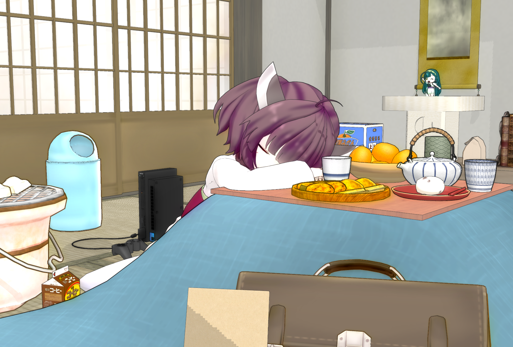 仕事を終えて帰ってくると、一足早く冬休みに入ってたきりたんがこたつでうたた寝してる…みたいな状況を想定してたんですが、せめて火鉢と餅は片してから寝た方がいいんじゃないかと。