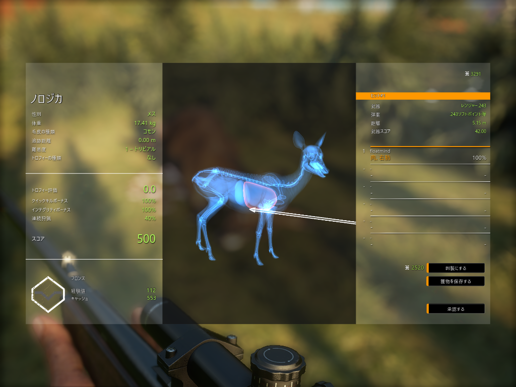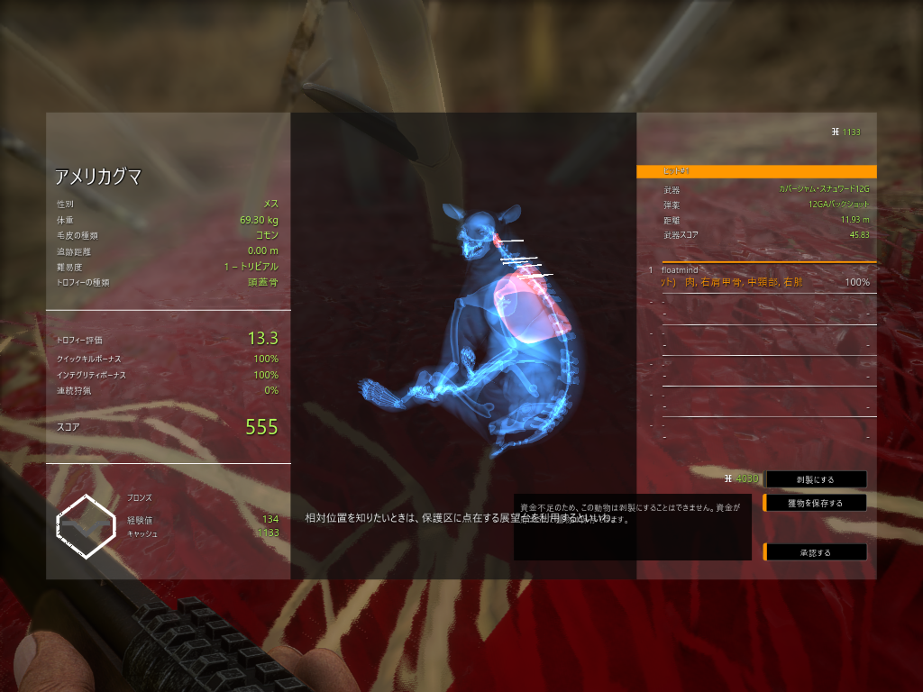 最初に仕留めたのがクマだったりとぼちぼちな滑り出しのように見えましたが、何も狩れないのがデフォで、バギーの運転もへっぽこすぎて3D酔いを起こして吐いて倒れたりと、まあプレイングはダメダメですわ。